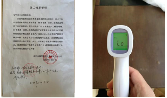 2月3日:1.安寧市工信局對福保祥瑞公司作準予復工復產(chǎn)批復,感到高興;2.安化社區(qū)借旭潤公司1支紅外線測溫儀使用。