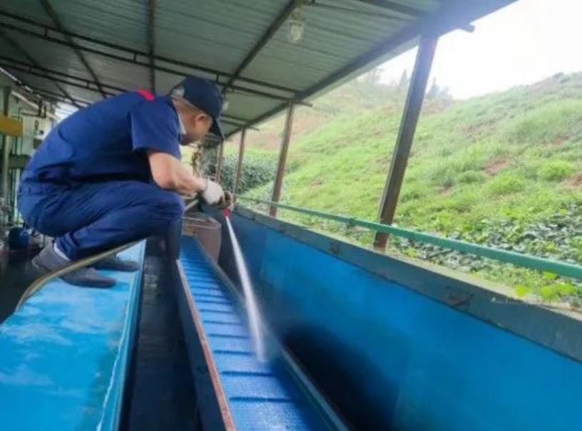 為保證設備正常運行,端午節(jié)期間,金沙人化工炸藥生產(chǎn)車間部分黨員、職工們主動放棄假期,利用停產(chǎn)時間,對生產(chǎn)區(qū)各類設備進行維護保養(yǎng)、藥卷冷卻鏈板及水池進行徹底清洗。盡管加班期間突遇雷雨天氣,每個人被房檐濺落的雨水打濕了衣服,但他們?nèi)匀缓翢o怨言,仔細清理,不折不扣地完成了清洗保養(yǎng)工作。