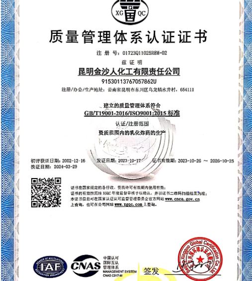【新聞】昆明金沙人化工有限責(zé)任公司通過ISO9001質(zhì)量管理體系認(rèn)證